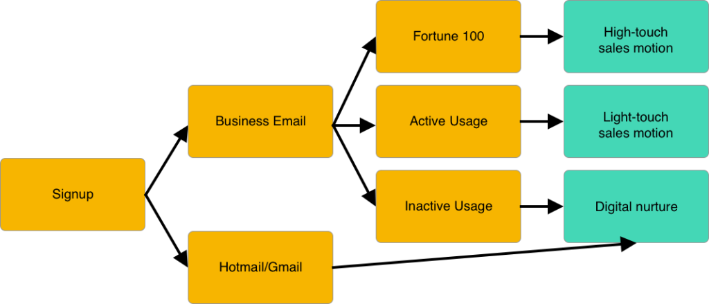 Low quality signups from gmail, hotmail, or similar email addresses. These signups typically do not convert to paid users at anywhere near the rate of high-quality signups. I typically put them into a digital email nurture. That said, you still may want to assign a junior sales rep to work these leads. Occasionally, you'll find a great customer hidden in this cohort.