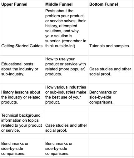 Each phase of the customer journey will necessitate different types of content. Upper Funnel "lookie-loos" are probably interested in your Getting Started Guide and your website copy. But Bottom Funnel users are probably in an active consideration phase and will benefit from benchmarks or side-by-side comparisons.